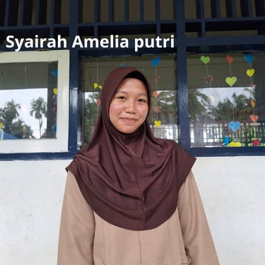 SYAIRAH AMELIA PUTRI, lahir di Jakarta, 2 April 2011. Beralamatkan di Kelurahan Kandang Kota Bengkulu. Hobinya adalah membaca, menggambar, dan mencari pengalaman baru. Bercita-cita ingin menjadi seorang guru. Di tim buletin, ia bertugas mengelola RUBRIK BERITA. Selain mengisi buletin, ia juga terlibat aktif di ektrakulikuler TIK dan Math Club. Motonya adalah Jalanilah kehidupan seakan impianmu akan terwujud hari ini. Selama menjadi tim buletin, ia banyak belajar cara menulis dengan baik dan bekerja sama dengan teman-teman. Pengalaman ini juga sangat menyenangkan karena ia bisa meliput berbagai kegiatan sekolah. Ia berharap tim buletin semakin kompak, terus kreatif, dan bisa membuat berita yang bermanfaat serta menarik bagi semua siswa.